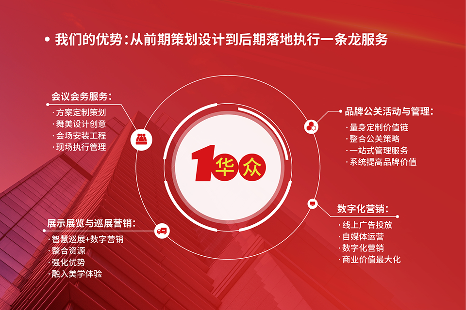 華眾傳媒集團(tuán)是在大數(shù)據(jù)網(wǎng)絡(luò)和新消費(fèi)交互時(shí)代為企業(yè)及其品牌全面賦能的營銷戰(zhàn)略公關(guān)公司。華眾傳媒集團(tuán)成立于2006年,總部設(shè)在青島,在北京、上海、廣州建立分公司,公司云集數(shù)百名公關(guān)、數(shù)字、營銷、設(shè)計(jì)等業(yè)界精英人才,旗下隸屬分公司有:北京華友世紀(jì)文化傳媒有限公司、上海天諾盛世廣告策劃有限公司和青島華和影視文化傳媒有限公司等多家子公司。公司積累了豐富的數(shù)字媒體、政府、時(shí)尚、圈層KOL等行業(yè)資源,服務(wù)項(xiàng)目輻射全國。業(yè)務(wù)范圍包含品牌公關(guān)活動(dòng)與管理、數(shù)字化營銷、自媒體運(yùn)營、影視傳媒制作、品牌巡展、網(wǎng)紅快閃店等多個(gè)板塊,涵蓋公關(guān)傳播與整合營銷的完整產(chǎn)業(yè)鏈。